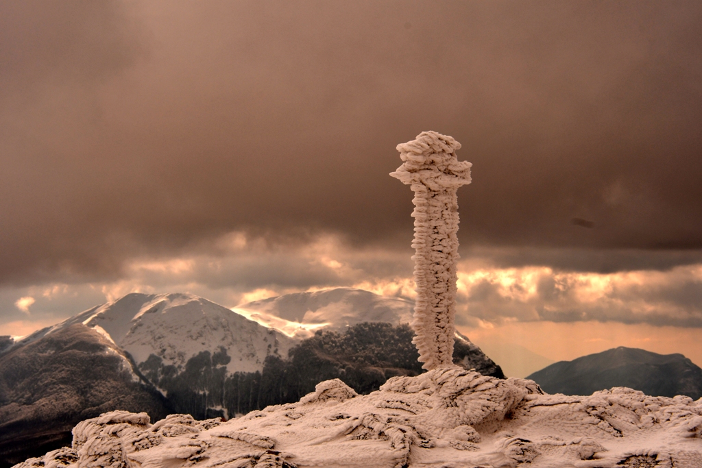 Miliardi di cristalli di ghiaccio accumulatisi in modo uniforme fino a creare un gelido lenzuolo sul terreno sottostante, si trovano improvvisamente scombinati e lordati da scarponi taglia 47 che trasportano più di un quintale di essere umano, zaino, macchina fotografica ed attrezzatura varia.