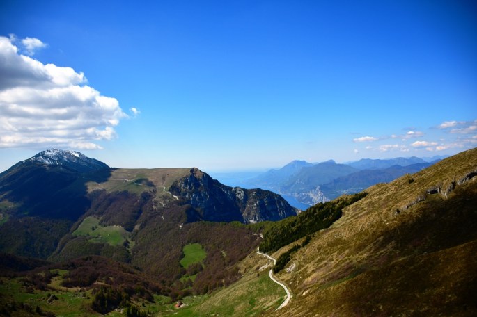 Il lago di Garda si stende ai nostri piedi. Una serie di cime nitide ed imbiancate lo circondano.